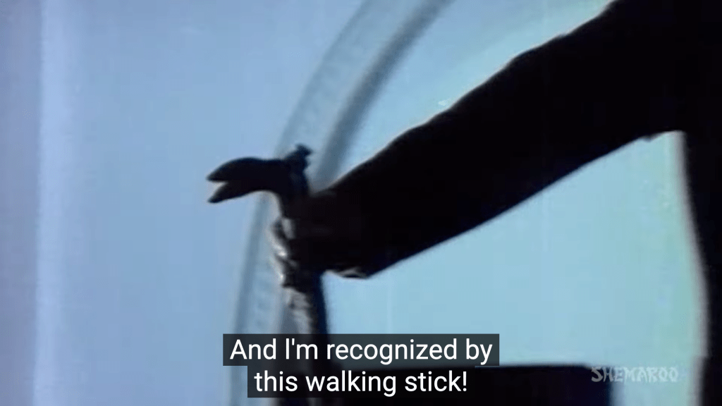 Pinky gets the whole story of her childhood from her mother. Mogambo #1 turns out to be Ajit Saxena, a friend of Pinky and Seema’s father. He claims it’s his duty as Nathani’s friend to help out the family. Pinky says the only thing she knows about Mogambo is that he has a walking stick just like Ajit’s, at which point I shout THANK YOU, PINKY at the screen, glad that we are acknowledging this surfeit of canes. She narrates that Mogambo wants Nathani to make a map, but neither she nor anyone else knows why or of what.