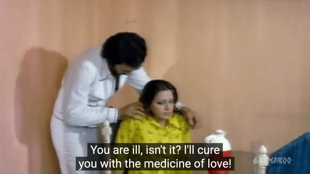 Seema is furious at this change of character, but Ratan convinces her that it was necessary in order to protect them and their loved ones. Yet another man appears with the same walking stick; this one is Mr. Dindayal, the owner of the Hilton. The hotel guests gather to celebrate the death of the police commissioner. Mr. Dindayal’s daughter Reena thinks she recognizes Seema despite everyone insisting it’s Pinky, saying that she can recognize the person’s true nature. Reena then helpfully launches into a song with lyrics about how appearances can be deceiving as Ratan tries to use his verses of the song to explain to her that she’s incorrect. I love when films give us entire songs with lyrics that work on their own poetically but also unfold plot elements with specificity, especially, as in this one, when onlookers benignly enjoy the performance without any idea of what the singers are trying to communicate.