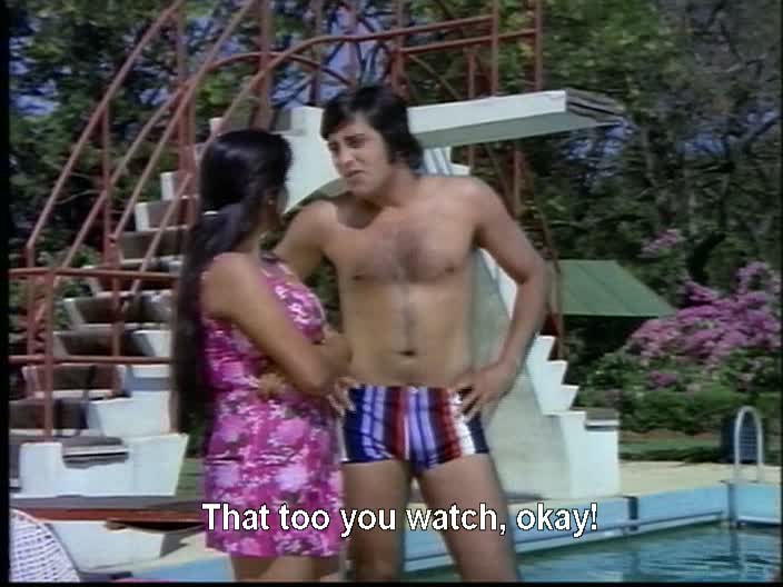 The most notable strength of this film is how often Pinky comments on Ratan’s handsomeness. Sure, she’s just doing a job, but the language adds a nice Bond-appropriate bad-girl flair. This is the era of Hindi cinema that sees the breakdown of the old distinction between heroine, a good girl who rarely expresses sexuality, and vamp, who dances suggestively, flirts with hero and villain alike, and sometimes dies for such sins. Pinky’s flirtation with Ratan is also a handy recognition that people attracted to men are part of the audience too; the makers know that there’s no denying Vinod Khanna’s sex appeal. Why else would they dress him in tight black leather and tiny bathing suits?