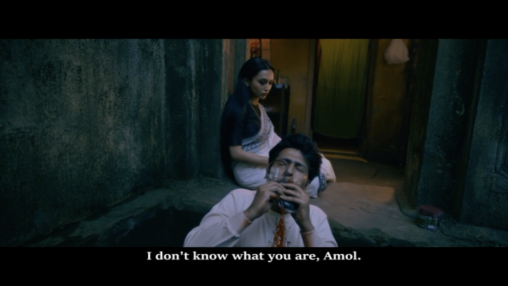 Meanwhile, Amol is harming himself as practice for police interrogation, fearing that he will give up his comrades’ whereabouts if the police put pressure on him. Raktim finds Bhuvan in hospital and apologizes; Bhuvan chokes out “Amol [yes! not Raktim!], please forgive me!” before flatlining. In the courtyard of their apartment building, Raktim starts drinking a bag of blood he’s taken from the hospital, wondering aloud to Manjari about what he has become.