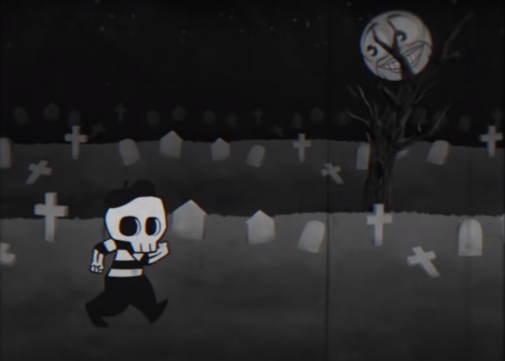 ‘Show For Children‘, for example, is an old-timey animated video in the style of 1920’s ‘rubber arm’ animation that you might associate with Disney’s Steamboat Willie. Straub’s version is about a cute skeleton named Cadavre, who is searching for his partner. Walking through graveyards and looking increasingly distressed, he looks in several graves, finding more and more grotesque material in each one. A menacing and possibly malicious moon, always grinning, follows Cadavre down a dark road to his eventual demise.