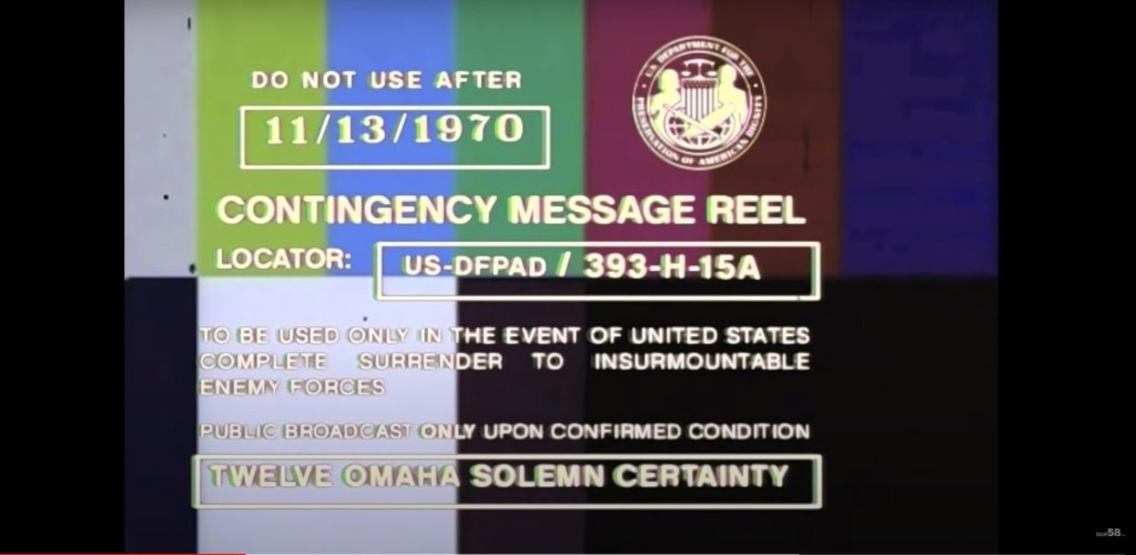 In my favourite segment, ‘Contingency‘, an end of day broadcast is hacked with an “accidental” reveal of a contingency communication from the “US Department for the Preservation of American Dignity that’s meant to play if the country is taken over by a hostile foreign power. The instruction is for citizens to “Act” immediately, asking them to assume the “Victory Position” (face up, feet together) on the front lawn and to eat a bullet in the name of liberty and honour, but not before euthanizing children and pets. It assures us that the President, Lyndon Johnson, has already “acted” and implores us to “let our united resolve echo through history: Even in defeat, we refused to yield.” The video ends by proclaiming the hacked message is a hoax, but a final title card breaks in at the end instructing the broadcaster to claim the message is a hoax. Tricksy governments! Either way, every carefully-crafted element–the detuned soundtrack of ‘My Country ‘Tis of Thee’, the glitchy, yellowed screen filter over an American flag–completely gets to me and like the best horror, keeps me coming back.