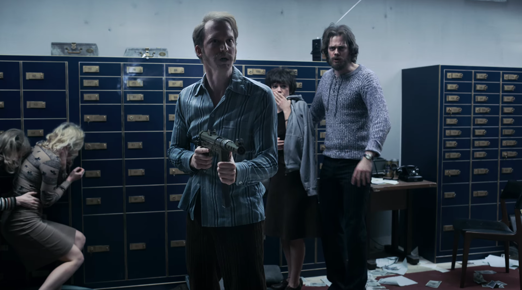 Which brings us to Tommy. The closest thing Clark gets to a foil is one of Åkerlund’s lies, the fictional insert of real-life Swedish supercop Tommy Lindström (Vilhelm Blomgren, Midsommar’s Pelle playing against type as your grumpy 1970s dad). Lindström had no involvement in any of these cases, much less a personal grudge against Clark, but the story needs someone not to fall for Clark’s crap, and apparently that person did not actually exist. So Åkerlund drafts Tommy, “Tommy Pony” to Clark, a little bit Javert and a little bit Clouseau, cursing and facepalming as Clark cartwheels through his carefree gangster life. Honestly, I kind of want a straight action-comedy that’s nothing but them. Sadly, they never reach the heights of a real Diabolik-Jenko rivalry, partly because the series does return to the truth, more or less, of Clark’s life. One thing the born frenemies will share though turns out to be the most famous incident in Clark’s notorious life: 1973’s Norrmalmstorg robbery.