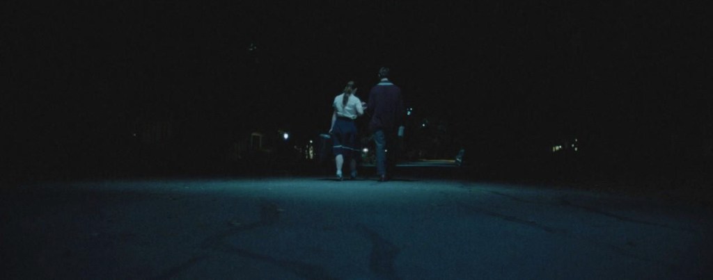 So basically: Next stop—The Twilight Zone. Shortly after the camera pushes through the barrier of the screen it flips to color, but since most of the film takes place in the darkness of the small town at night it has a kind of black and white quality to it anyway. You’re dropped into the town of Cayuga, New Mexico in the middle of setting up for a basketball game at the high school. The camera follows fast-talking radio disc jockey and apparent town celebrity, Everett Sloan (Jake Horowitz), as he rockets through the chaos, greeting folks and making jokes in 1950s slang at top speed – and the film is almost all walking and talking. The experience is a bit like being dragged behind him at a distance like cans on a string, bouncing off of characters and scrambling to get your bearings. It’s both very much what the rest of the film is like and not at all what the rest of the film is like.