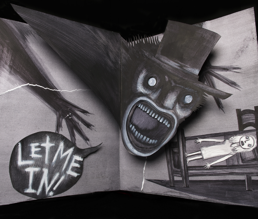 Let’s take an example. It’s not one that is often put together with the films in the meme, but I think it’s actually a great outline of the formula, even if its arc doesn’t bend as close to filicide as Lucille Bluth might like: Jennifer Kent’s The Babadook (2014). In The Babadook, widow Amelia (Essie Davis) is exhausted and desperate, barely balancing her dreary nursing home job with care for her disturbed 6-year-old son Samuel (Noah Wiseman), all the while suppressing the constant thrum of grief for her husband Oskar, who was killed in a car crash on the way to the hospital to deliver Sam. Heavy, heavy stuff. Adding to the pile, Samuel has become obsessed with a monster he calls the Babadook, an obsession that sees him fashioning weapons and traps like an Elm Street kid and, also like an Elm Street kid, refusing to sleep. Soon, Amelia–who was a children’s book illustrator before Sam’s birth and all the terrible things that came with him–discovers a horrifying picture book among Samuel’s things. Amelia’s genuinely disturbed by the story of the child murdering Babadook, but throwing the book away helps nothing. The book comes back, scarier than before, and so does the Babadook.
