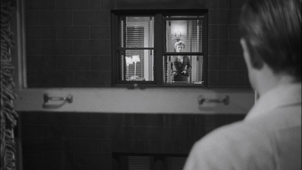 Meanwhile, commercial pilot Jed Towers (Richard Widmark) is serious about Lyn Lesley (Anne Bancroft), but Lyn is put off by Jed’s lack of concern with other people. The specifics are different in the novel and the film. In Mischief, Jed refuses to give a homeless man some money, claiming the man has “a racket.” They fight about it over dinner. Lyn calls out Jed’s “cheap cynicism” and his disregard of others. In the film, Jed finds Lyn in the hotel bar where she works as a singer. It seems like they’ve already had their fight about Jed’s cyncism and Jed (Richard Widmark) is trying to convince Lyn (Anne Bancroft) to put it aside for “a laugh, a kiss, and a drink.” Lyn tells Jed he lacks “an understanding heart,” and she doesn’t want to see a man who doesn’t care about anyone but himself. She also tells him, in an excellent line, “I’m not angry, just furious.” And so Jed furiously decides he’ll have a date with someone else. In both the novel and the film, Jed returns to his hotel room and sees Nell in the Joneses’ room across the courtyard. Jed calls Nell and invites himself over. Once Jed’s there, though, he’s not so sure, but any ambivalence Nell felt is gone. She’s not just pretending she has a different life with Ruth’s things anymore. And Nell’s not letting anything interfere with her desires and delusions—especially not a nine-year-old girl.