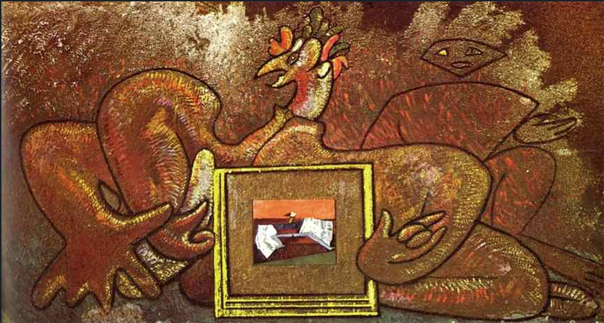 I assume Bruce Ernst’s last name is a reference to Dada artist and Surrealist Max Ernst. At the same time, I can’t help but wonder if Bruce’s first name is a reference to Bruce Campbell. There’s a smidge of Evil Dead II (1987) in A Wounded Fawn and the film has about as much respect for Bruce as Sam Raimi and Bruce Campbell have for Ash, played by Campbell in the Evil Dead films and television series. Like Ash, Bruce takes a lot of damage in his cabin in the woods. He argues with himself or his doppelgänger in his madness and, in the credits sequence, Bruce pulls his own version of Ash’s possessed hand attacking him. It would be a delightful mixture of influences to me if it’s the case. Regardless, both Max Ernst and Bruce Ernst have bird alter egos. Max Ernst’s alter ego, Loplop, was much more playful than the Red Owl and Ernst has a series of paintings presented by the bird.
