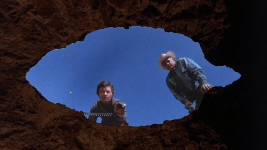 I do love this movie, but I will freely admit it’s mostly for the wrong reasons, silliness and 70s fashions mostly. I could wear anything Janet Leigh or DeForest Kelley wears any day of the week. Style icons. Yet there are beautiful moments in this film sometimes. I love the eerie isolation in the shot of Cole being forced to walk back to town. I love the underground view of Elgin and a rancher through an eye-shaped rabbit hole. Overall, the forced perspective is pretty terrible and I would love to see what the movie would be like with different foley ideas for the rabbits than canned audio from Rawhide, but for all the bad bunny footage, the sequence where Janet Leigh defends her daughter with a flare impresses me. Bunnies to approaching helicopter to Janet Leigh brandishing a flare and back, contracting the space, keeping it tense. But mostly it’s a big silly time, and part of me grieves that honestly, because I can see that some people did genuinely work hard on this thing only for it to be a joke in the end.