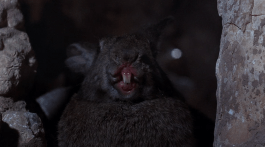 Lepus has certainly eclipsed its source material entirely. Australian sci-fi author Russell Braddon penned The Year of the Angry Rabbit, the slim novel on which Lepus is based, mainly as a joke. Its satirical story of Australian politicians weaponizing a failed rabbit pesticide against humans only to be terrorized by the rabbits they failed to kill is more Joseph Heller than Bert I. Gordon, although these rabbits do end up supersized, too. It is telling that in this intentionally comic novel, the mechanism of the eventual giant killer rabbit plague is still more complex than what Night of the Lepus presents, having rapaciousness conferred by the bum pesticide and then giant bunny syndrome from a failed plan to nuke the killer rabbits. And this goes to why Night of the Lepus, humorless as it is, is probably funnier than The Year of the Angry Rabbit, too. The refusal to embrace the absurdity of the situation only throws the technical deficits of Night of the Lepus–purported massacres that just look like someone burst a ketchup packet, the supposedly frenzied rabbits loitering benignly around obvious doll furniture–into sharper relief. It’s the kind of film seemingly made only to be pulled apart, a movie so absurd on its forced perspective, twitchy bunny-nosed face, who could ever have imagined it as a serious horror movie? Only the people making it, apparently, if them. Would it be scarier if it embraced how funny it is, more on the order of something like Tremors (1990)? Maybe? It certainly couldn’t be funnier.