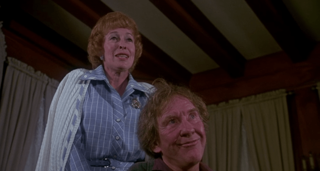 After running into the delightfully earthy handyman (Dub Taylor), the Rolfs meet the house’s owners, an enigmatic, somewhat queer-coded brother and sister, Roz (Eileen Heckart) and Arnold Allardyce (Burgess Meredith). The Allardyces are well-bred and congenial and not business-like about this business at all. Instead, they appeal to Marian’s emotional investment in the house, and it is less that they are looking for renters than hoping for caretakers. As such, their ask for the place is $900–not nothing certainly, even now, but a shockingly low number for such a huge property for an entire summer. The catch–though the Allardyces deny it is one–is that their mother will be remaining on the property. Their mother who never ventures out of her room. As if that’s a reassuring thing. All they ask is that the Rolfs bring her meals to her. That’s all. Unquestioning Marian is ready to start schlepping tea trays immediately, so that only Ben (and the audience) are looking at Burgess Meredith wax rhapsodic about the immortality of the house and thinking mom must be either Mrs. Bates or something worse.