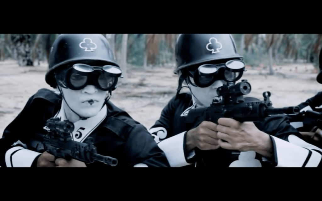 Most of what I liked in Tasher Desh is the visuals. The playwright’s frame is in black and white, maybe to add a timelessness or to reinforce the palette of ink on a page, the world the playwright inhabits? It’s a much softer black and white than that in the card country, which is punctuated with bright red as well. The playing card guards speak in huge block text placed around the screen that looks very different from the standard subtitles. I’ve never seen anything like this, and it’s incredibly effective.