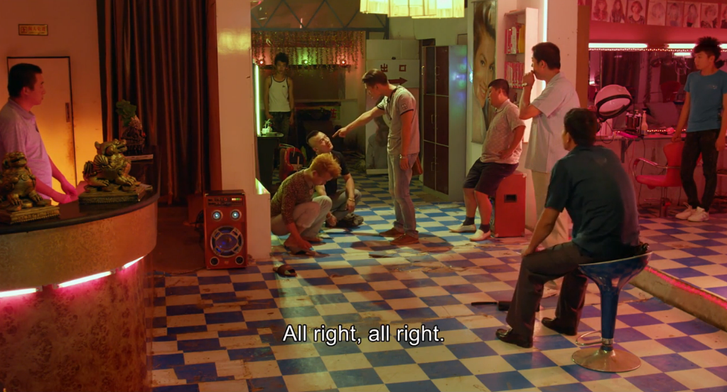 With The Wild Goose Lake, Cinematographer Dong Jinsong returns to give us a fantastic sequence where Liu Aiai follows Shujun to a night market where people are line-dancing in light up sneakers. The camera almost runs a relay with Liu Aiai, Shujun and Huahua as everyone dances to Boney M’s “Rasputin.”