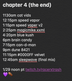 There’s also an immediacy to a wave screening. Segs and waves tend to vanish – at least for a while – after they’re screened, only sometimes reappearing in retrospective streams from the wavers that created them. Archives exist for waves that premiered months or years ago, but there’s no VOD here to catch up on a fleeting seg that you missed, so it feels like an increasingly rare experience of catching something cool or weird on broadcast TV or the radio, never knowing where or if you’ll see it again. Perhaps it’s Netflix that’s truly being dethroned.