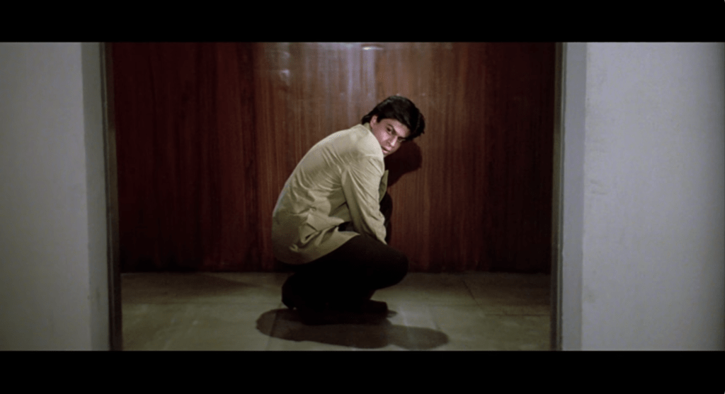 The story of Darr is simple: the obsessive Rahul (Shah Rukh Khan) loves Kiran (Juhi Chawla), even though she is in a relationship with Sunil (Sunny Deol). Rahul has never even really met Kiran, instead secretly watching her and sending anonymous communications that soon spiral into threats. He repeatedly harasses her over the phone, interspersed with phone calls to his mother in which he cheerfully discusses his love and his assessment of what Kiran should do and feel…except his mother is dead, underscoring how very unwell this fascinating young man is.