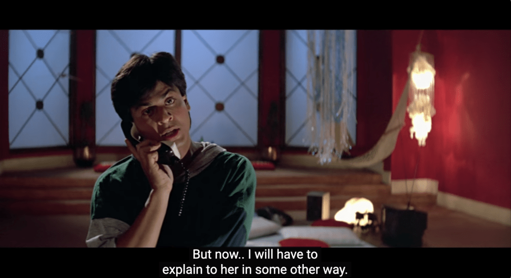 I love how the movie hints that the hero and villain can be different sides of the same coin. From the onset, they are compared and confused. Kiran thinks a serenade by an unseen singer is from Sunil, but it’s really Rahul. She thinks hands covering her eyes during a black-out at her birthday dinner are her boyfriend’s, but she’s dead wrong.