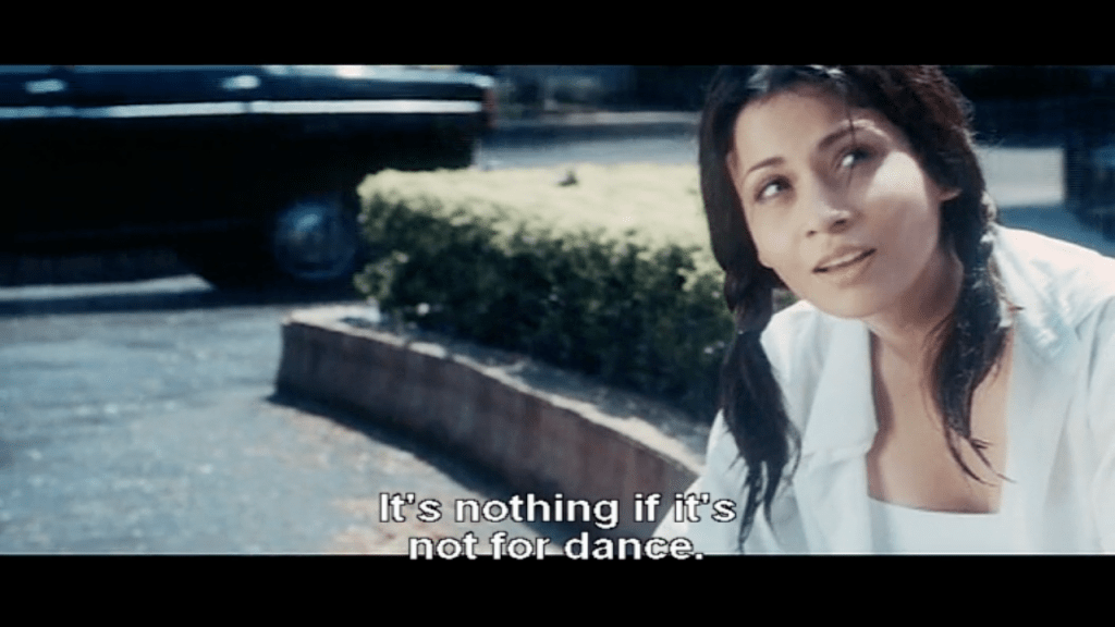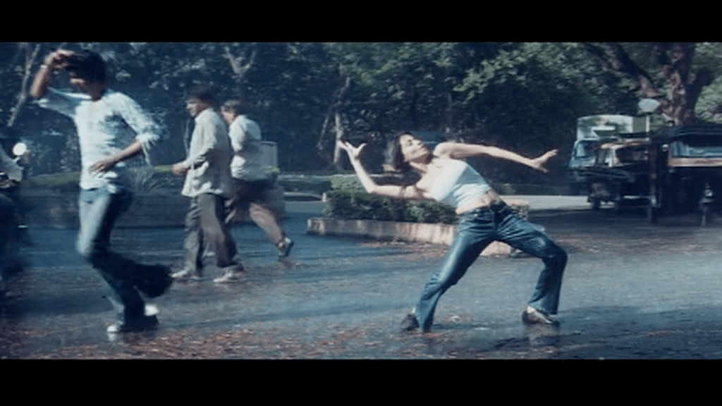 There’s something down-and-dirty about this sequence. Bollywood rain sequences usually appear for heightened drama in a conflict or to make material unexpressed emotions, but here I think the rain is simply an impediment that Reva overcomes as she creates her art; along with rain, she determinedly ignores pedestrians, vehicles, and children crowding her space. And then we see Reva in bed staring at her alarm clock: this was probably a dream, literally and metaphorically. Either way, it was self-authored. She heads to a meeting at a film production office, where she crosses paths with Abhi the actor (Abhishek Bachchan). On the bus home, he says “I’m an actor, but I haven’t acted yet” and admits that he can’t dance—a sin for a wannabe Bollywood hero in 2004. She says she’s a dance director but hasn’t directed anything yet. As far as meet-cutes go, it’s very cute, and it lets them share their opinions about what they do. He’s not convinced heroes should have to dance, but she defends the art well enough that he’s interested in learning more and asks her to teach him. The differences in their artistic ethics become clear immediately: he lies to a new director who wants to cast him that his dancing is merely “out of practice” and asks for two weeks to brush up, whereas she tells the producers that she honestly thinks the music they gave her to audition with is sub-par and walks away. She needs rent money, though, so when Abhi tracks her down to ask for dance lessons, she agrees.