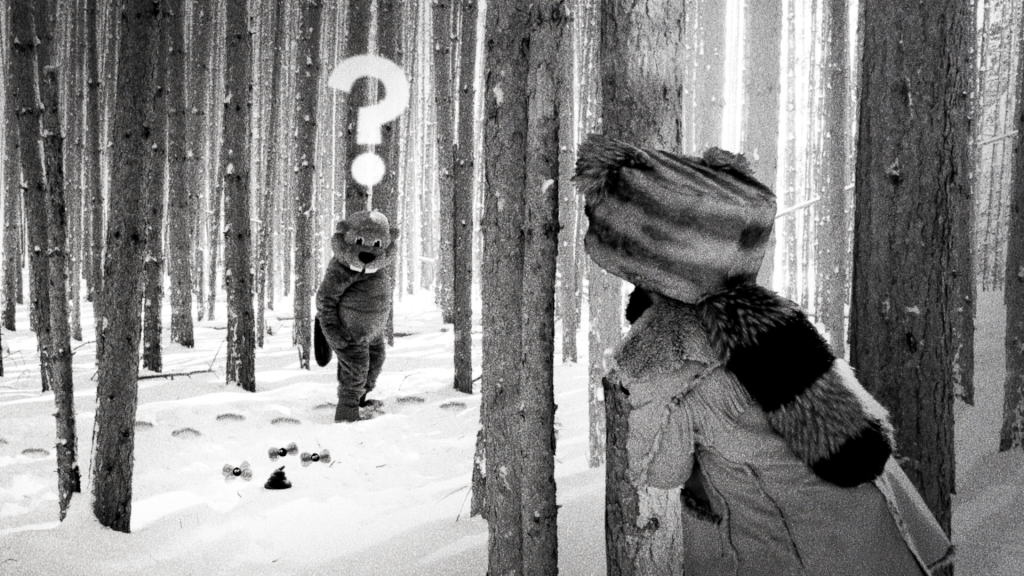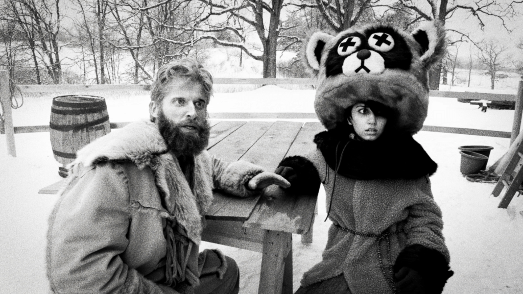A key part of Jean’s progression through the game of wilderness survival is the store, to which Jean returns throughout the film as one would in a game like Metal Gear. The store, run by The Merchant (Doug Mancheski) contains useful items of different prices that are ‘unlocked’ as Jean obtains money and pelts, while also signifying key changes in Jean himself. Jean starts out with a comically-small knife which he immediately uses to attempt to commit seppuku out of sheer despair, before thinking better of it and trading it to an indigenous trapper (Luis Rico) for snowshoes to better traverse the snowy landscape. As he gains some small bit of confidence in his abilities to trick and trap his buck-toothed nemeses, Jean uses the barter system along with a small bit of ingenuity and luck to eventually purchase ropes (handy for when you don’t want to cut up your clothes), bear traps, a gun, and perhaps an engagement ring from the surly but tender merchant.
