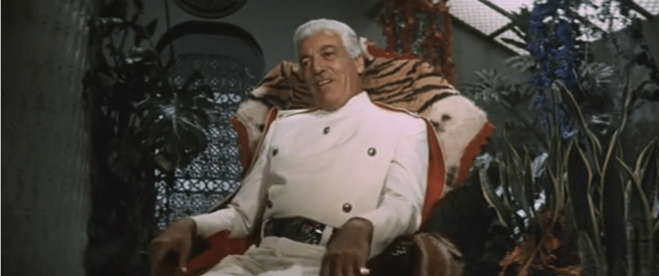McKenzie’s foil is Malic, whose very name evokes malice. Malic is his former schoolmate and colleague, and a year younger than McKenzie at 203, but has now become a mad scientist with a magnificent villain lair, Blood Rock. Aided by the gloriously caftanéd Lucretia (Patricia Medina, Cotten’s real life spouse) and Kuroiga (Hikaru Kuroki) the commander of the evil super submarine, The Black Shark, Malic aims to destroy Latitude Zero and everything it stands for. Well, everything except some of its treasures he wants to keep for his own nefarious scientific and fashionable ends. At Blood Rock, Malic swirls his capes and skirts and lounges nonchalantly on a be-tiger-skinned throne wearing evil naval whites and thigh high patent leather buccaneer boots. Malic gives villainous monologues, menaces the innocent, and performs horrifying surgeries. Threatening Dr. Okada (Tetsu Nakamura), a scientist Latitude Zero is intent on recruiting, Malic says: