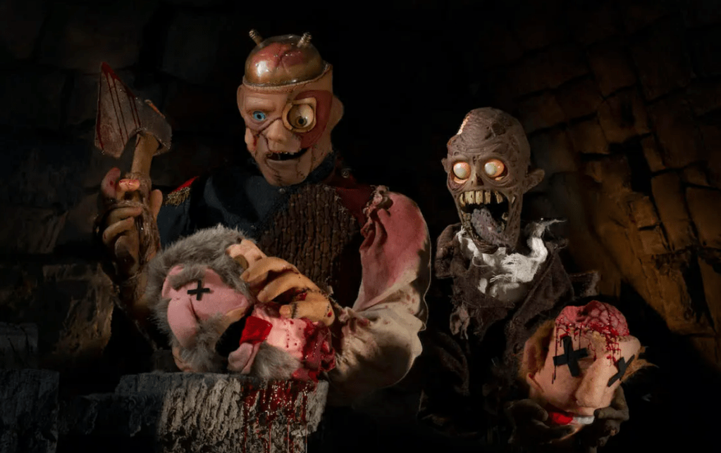 Most of the more recent horror-themed puppet movies I’ve come across in my search have tipped heavily towards super violent, which makes sense in horror and gives an opportunity to play with puppet intestines, even if that’s not my favorite thing. It might be yours though, so here are a few of them. Stitches (2023) is a sock puppet horror-comedy directed and filmed by Ian Goodwin in a two-bedroom apartment during COVID, which is impressive and clever but I quit watching because I couldn’t get past the date rape jokes early on. One stand out is Jesse Blanchard’s Puppetcore Frank and Zed (2020) , which is a brilliant but incredibly gory all-puppet tale of two reanimated best friends trying to live a peaceful zombie life in an abandoned castle until a local official tricks the villagers into attacking them. It definitely meets the criteria of Muppety puppets, horror, humor, and heartwarming moments, but wow, is it violent.