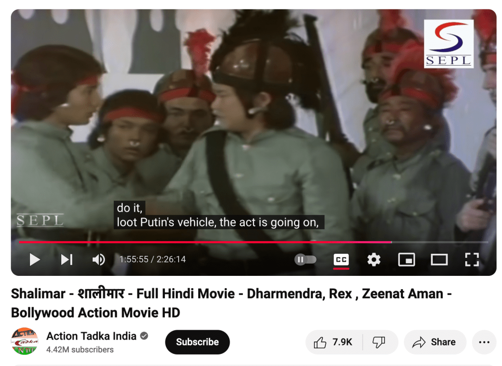 * The English version, called Raiders of the Sacred Stone in its American release, is on Youtube for free. The full Hindi version is there too, but I do not recommend gambling on the automatic English translated captions because when I spot-tested them they referred to Putin, who at the time was in the KGB so maybe really was on San Dismas Island and trying to steal a ruby? I’ve had good luck with Youtube’s translating technology on other films, but here it’s very ineffective. The audio quality overall is not great, and I assume that interferes with comprehending the Hindi properly.