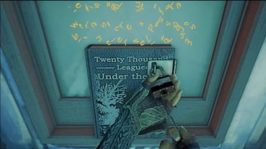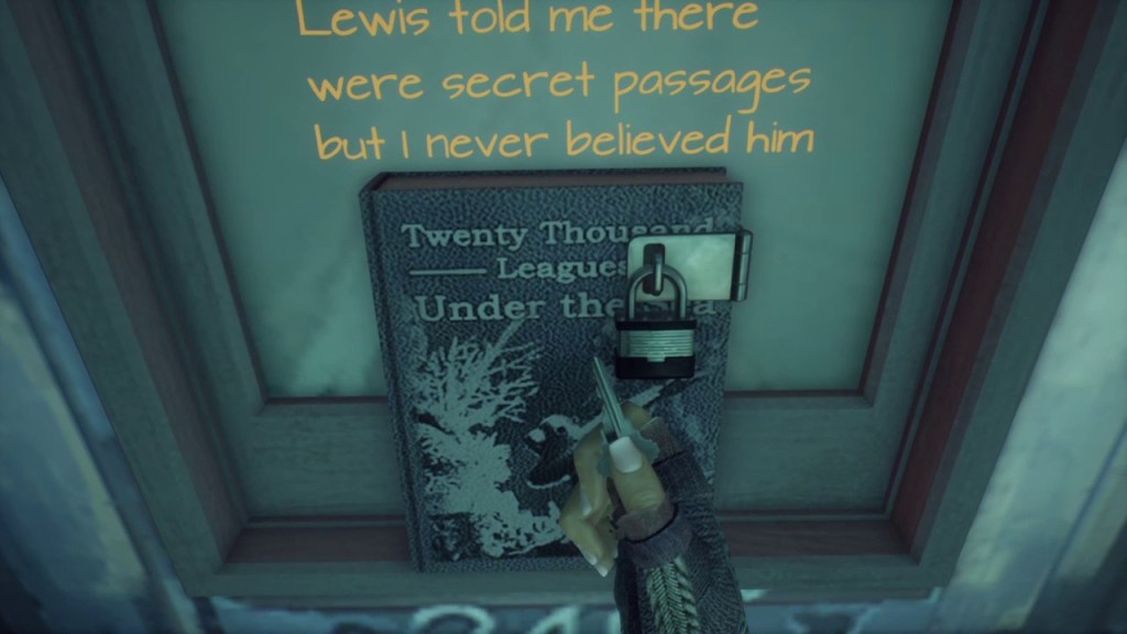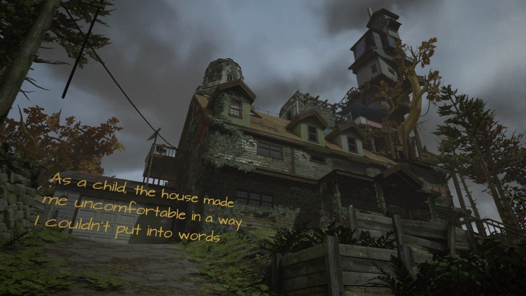 The house itself looks like something out of a popup book, crooked and unexpected, as if new rooms and turrets have accreted over time in an organic response as each dead Finch’s room was locked away like a shrine. It gives the house a living quality, like in Robert Wise’s classic 1963 movie adaptation of Shirley Jackson’s The Haunting of Hill House, but less malevolent. The objects in the house are mostly not interactive, but that makes the experience more like visiting a historical site with a tour guide, which fits well both with the structure of the game and the mausoleum quality of each dead relative’s room. It does feel like the house is interacting with you, though, because of the creative way they handle the text. Words scroll out across the backs of chairs or scatter in the breeze as Edith narrates, sometimes taking the shape of a road leading somewhere or running away from you to be captured.