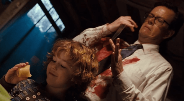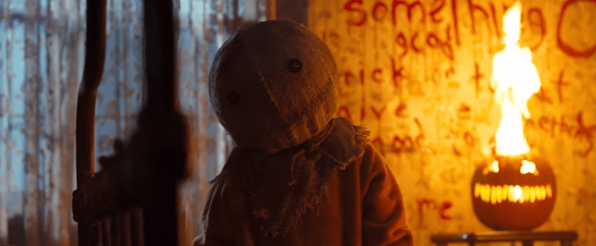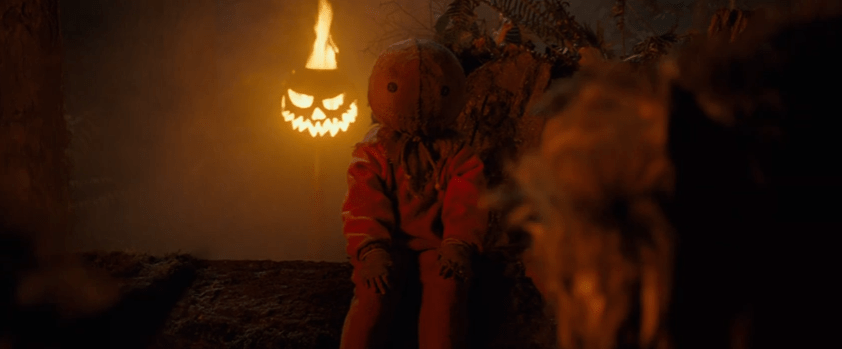 But whereas the Krampus is borrowed from folklore, Sam is inspired by folklore. And maybe a little bit of Pumpkinhead. I don’t think it attenuates Sam’s credibility in the least that he was born in the 2000s though, and he is much like Doughtery’s Krampus in that he’s as merciless as he is amoral. But I think Sam also plucks at the same heartstrings Krampus’ hero, Max, does, when he quietly appears at the end of a line of trick-or-treaters on Principal Wilkins’ porch, the steps still slick with blood from one rule-breaker’s unlucky end, or when he unexpectedly accepts a candy bar from a badly injured old man instead of finishing him off. It’s not just that he looks like a preschooler from 1920s, endowing Halloween literally with a child’s heart like Max’s, but that Sam, silent as he is, cares. He is the protector of Halloween, just as Max, in his dysfunctional family anyway, was the protector of Christmas. In Krampus, Max’s grandmother says, “I think Santa is what you make of him,” with the implication that if your heart is soured with darkness, your Father Christmas will reflect that. Well, Michael Doughtery makes Halloween into the shape of a child, and his movie reflects that. It’s a brilliant choice that elevates the material even as it binds the macabre stories together into a single ghoulish, garish night. And it also makes for a really cool Halloween costume.