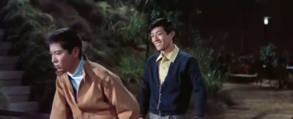 Recap: Hamada Mitsuo was a teen idol superstar beginning in 1960. In 1966, however, he was collateral damage in a bar attack in which a glass shard penetrated his eye. You are My Lover is his comeback film after more than a year’s convalescence. In Part One, I discussed the significance of the Nikkatsu stable of stars appearing as varying degrees of “themselves.” In Part Two, I deal with the film’s peculiar attitude to the narrative it presents.