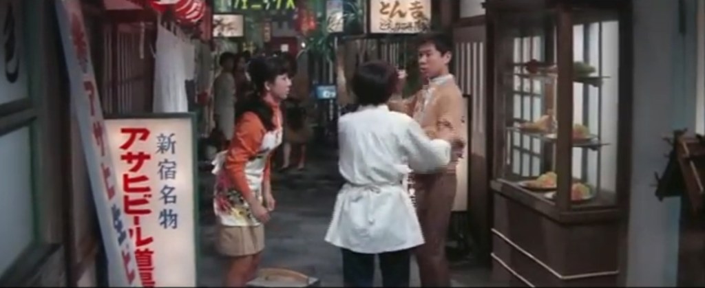 When the screen unfreezes, Hamada hurries through the actual Shinjuku then transforms instantly into his character Mitsuo on a soundstage version of a Shinjuku street where he bumps into a woman carrying food deliveries from a ramen restaurant, causing her to drop them. Masako (Izumi Masako), the owner of the restaurant, emerges and Mitsuo washes dishes to compensate for the destroyed orders. Taking a profound interest in Mitsuo, Masako pursues him tirelessly, even as he rebuffs her with increasing brusqueness.