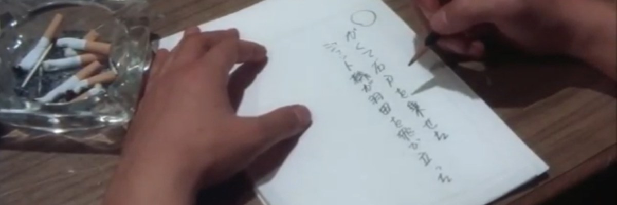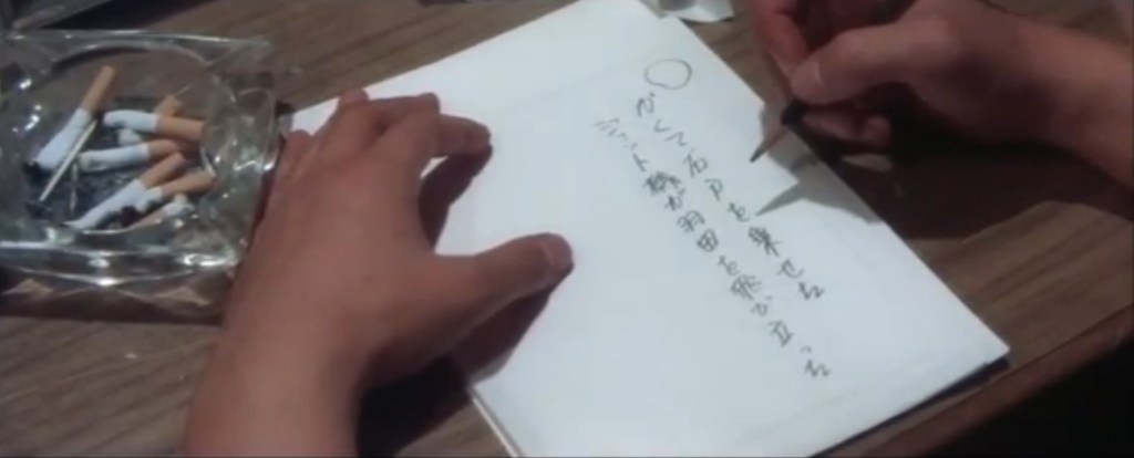 The shot of Ishido’s jet taking off is followed by a cut to a close-up of a hand writing: “The jet carrying each of the Ishido family members took off from Haneda Airport.” The hand belongs to the screenwriter for the film, Akai (Watari Tetsuya). Akai takes a break from his dissatisfaction with the dialogue by going bowling. Although Ono’s plans sound ominous on the level of the plot, the danger is mitigated meta-cinematically when Akai gets a call at the bowling alley from a producer who complains the script so far is too cruel and insists Akai soften it.