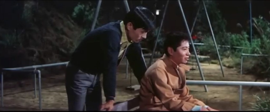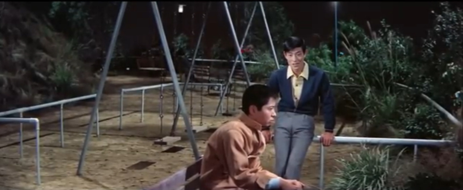 The official Nikkatsu Studio plot synopsis includes scenes in which singer/actors Araki Ichirō and Funaki Kazuo learned of the film being made and asked the producers to include them. Although these scenes did not make the final cut, the actors’ wishes were granted. In Part One I described Araki’s encounter with the Ishido-gumi after singing. Funaki has a more direct involvement with Mitsuo and the scene itself seems to reflect the producer’s request to soften the plot. Funaki plays Mitsuo’s former workmate, Funayama, whom Mitsuo encounters in a barren playground at night. The tenderness Funayama expresses suggests a homoeroticism not elsewhere in the film.