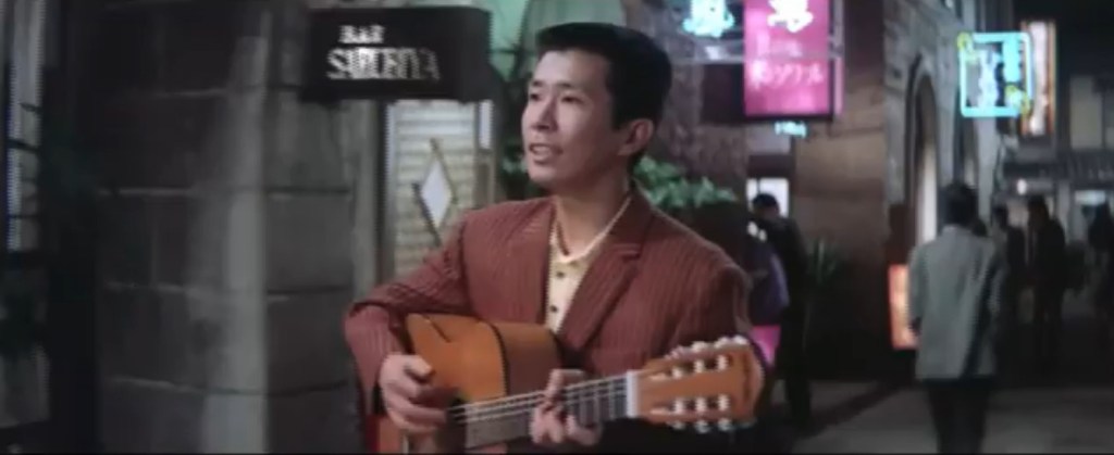 The resumed story begins with the singer Inoue Shigeru (Katsumi Shigeru) performing in the Shinjuku streets, which angered the Ishido-gumi running a protection racket for singers in the area. In Part One, I described Araki Ichirō’s encounter with the gang, and the Johnnys’ attempt to support Inoue by also daring to perform in the neighborhood, unsanctioned. This time, the gang marked Inoue for death and gave the assignment to Mitsuo who stalked Inoue into the park, stabbed him and left him dead, floating face down in a fountain.