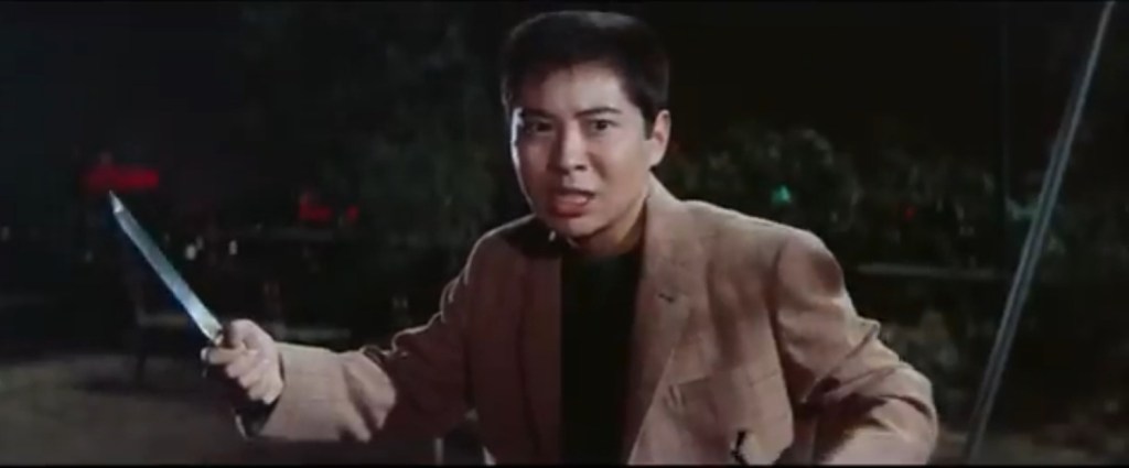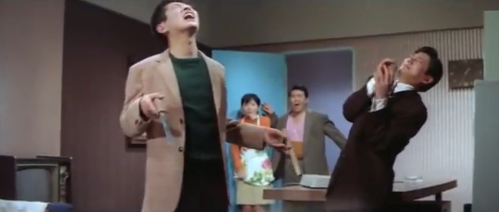 When Mitsuo returns to the bar hangout, he overhears one of Ono’s men admitting that they intend to set Mitsuo up for the crime and deny any connection. Mitsuo bursts in, fatally stabs the gang member, and heads for Ono’s office. There he kills Ono’s other assistant, and stabs Ono who manages to stab Mitsuo before dying.