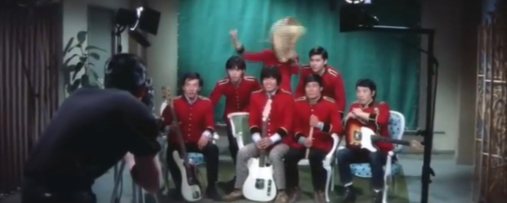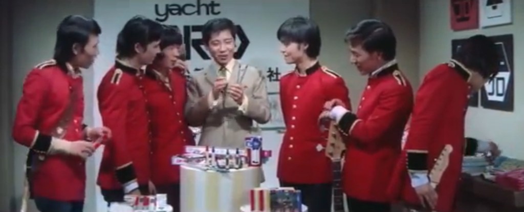Mitsuo’s quandary plays out on two levels: on the level of the plot–that of a young man in over his head, on the level of the film–a character who suspects he’s in the wrong genre. The film itself takes a break from Mitsuo’s dilemma, cutting to a publicity photo session for the rock group, The Spiders. As it turns out, Hamada is in the next photo studio, shooting a promotion for a new pencil.