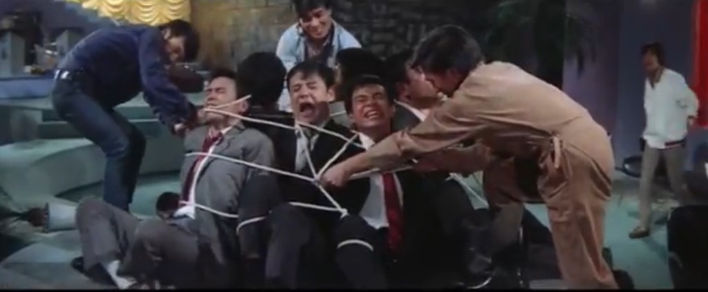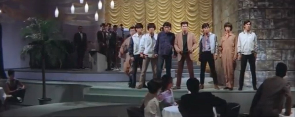 Akai is astonished at such a request. He says that You Are My Lover is an art film that cannot be altered and he is too busy writing for television to even consider it, then throws them out. The Spiders tperform loudly beneath Akai’s window for two nights until Akai relents. Akai writes: “Drawing on the power of his former colleagues, Mitsuo attacks Ishido Industry’s main headquarters, the nightclub Shiro.” The scene changes to the nightclub featuring a nearly naked dancer, when suddenly Mitsuo and the Spiders appear on the stage and begin fighting the Ishido-gumi. Ono and his main assistants are now alive and unharmed but they are defeated. The staccato editing, cartoon-like fight choreography and the garish setting recall the climaxes in the 1966-8 ABC-TV Batman series. This is no accident. The series was broadcast in Japan at the time and the theme song was done by another Johnny Kitagawa boy band that, like the Johnnys before them, had Kitagawa’s name as part of theirs: Johnny’s Jackey Yoshikawa and his Blue Comets.