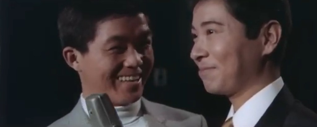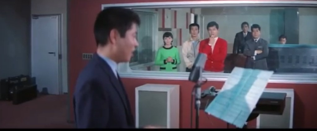 Masako expands Mitsuo’s second chance by introducing him to a record company executive (played by Hayama Ryōji, the intended target of the attack that wounded Hamada). Mitsuo’s recording session/audition is attended by Hayama and the producer played by “Mighty Guy” superstar Kobayashi Akira.