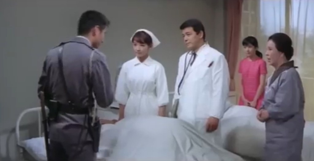 The sequence includes a scene in a hospital room in which Mitsuo is treated for his injuries acquired in fighting Ono, sharing the room with Inoue, who in this version survived Mitsuo’s knife attack. Inoue refuses to press charges, and forgives Mitsuo, saying “Everyone deserves a second chance.” But since Mitsuo’s killing of the Ishido gang was erased, why was his attack on Inoue retained? The scene will take on a dark irony retrospectively. As I mentioned in Part One, Katsumi Shigeru, who played Inoue, in 1976 strangled his mistress and left her body in the trunk of a borrowed car. He was sentenced to ten years in prison, but was paroled in 1983. Katsumi also was inexplicably given a “second chance” and booked on a tv variety show, but popular outrage ended that.