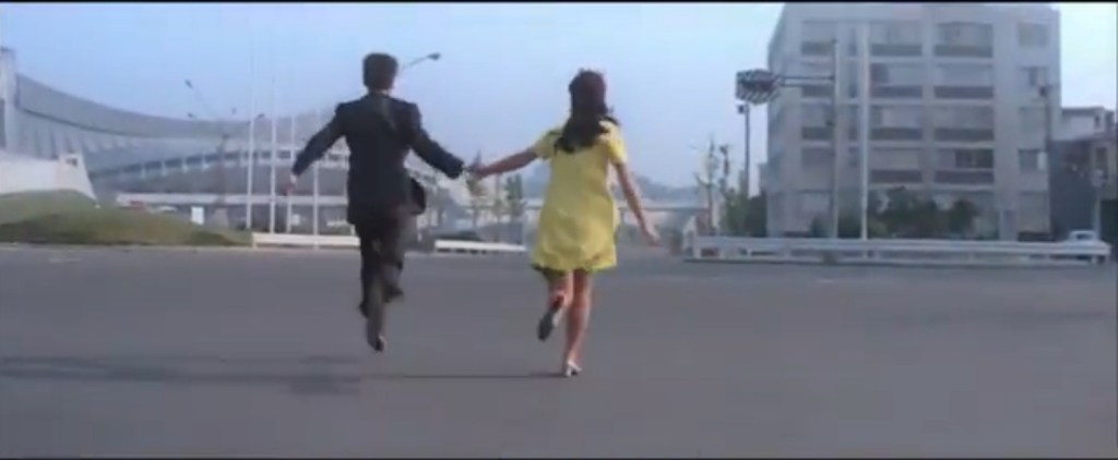 There is a detail in the shot before the duet, however, that complicates You Are My Lover’s final framing, as I mentioned at the beginning of this essay. When they begin to sing, there is another shot of the audience, but now Izumi Masako as the character Masako is in the front row, which folds this musical reality back into the film’s fiction, like a Moebius loop. The film cuts to Masako throughout the duet. At the end of the number a close-up of Sakamoto and Hamada’s handshake dissolves into Hamada’s and Izumi’s clasped hands as they run through empty Tokyo streets as the title song plays them off. Mitsuo completely ignored Masako throughout the film and even disparaged her as “a meddlesome woman.” But the final shot demonstrates the function of genre to generate a romantic closure to vindicate the title song..