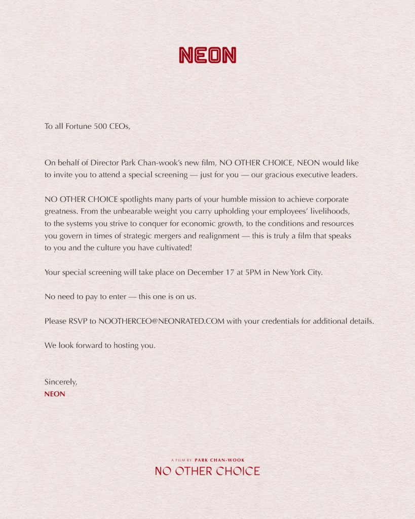 No Other Choice (South Korea, 2025) dir. Park Chan-wook. Written by Park Chan-wook, Lee Kyoung-mi, Lee Ja-hye, and, hey, Toronto’s own Don McKeller is in there.