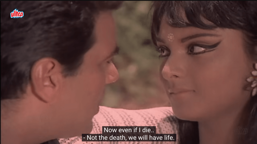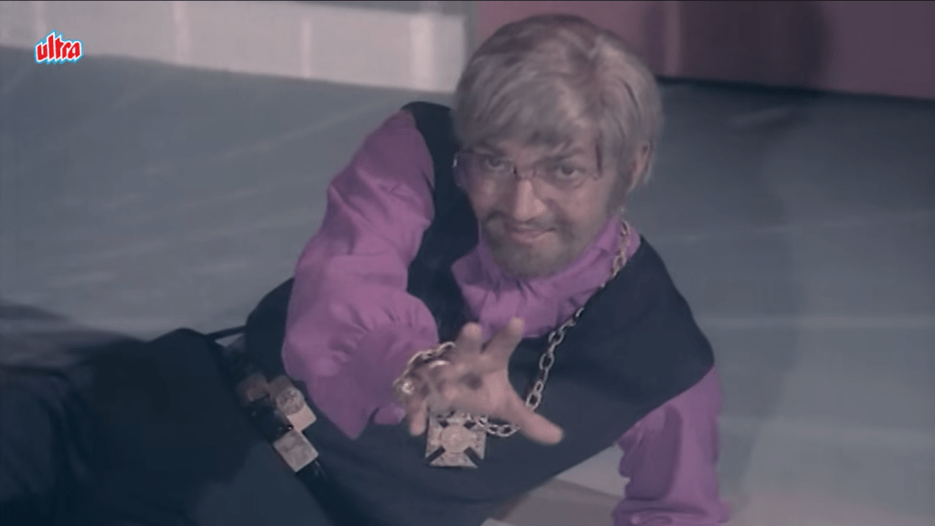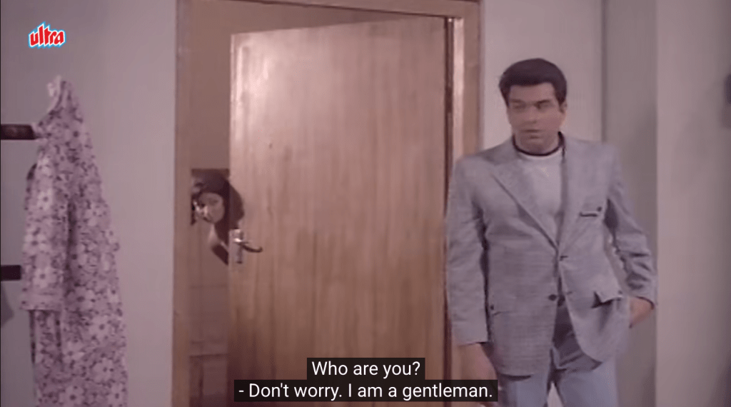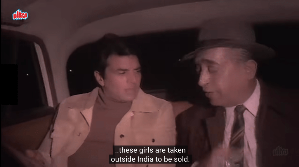 The laid-back heroics of star Dharmendra are a major reason to watch Keemat. He all but winks through most of the film as Gopal/Agent 116 on the hunt for human traffickers, happily dispatching baddies with barely a hair out of place before delivering one-liners or kissing the heroine. Dharmendra is a Hindi film star like no other, and after his death at the end of 2025, it is my duty and honor to share another of his films with Gutter readers. He had an astonishing career for decades, starting as sensitive romantic lead, transitioning to a funky action hero in the 1970s, then a growling machine-gun-toting elder in the 1980s and 90s (remarkable, really, given that he was in his 50s at the time), and eventually beloved paterfamilias, still melting hearts at age 88 in one of his last films (Rocky aur Rani Ki Prem Kahaani). His obituary in the New York Times used the phrase “easygoing machismo,” and I couldn’t agree more. The macho side of his persona must be acknowledged, but equally significant is the absolute effortlessness of his charm. Playing a Bond-like character who is steamy and aggressive while also doing the right thing for India is a perfect fit for him, and I can’t think of any other male stars at the time who could have done it as well. They simply aren’t formidable enough in this kind of context.