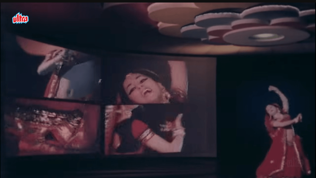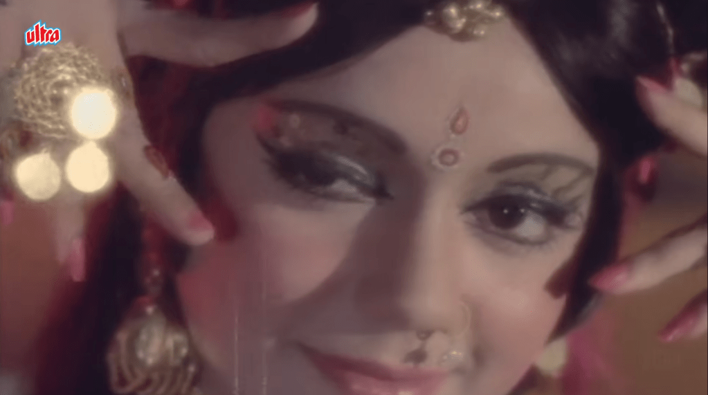 - and a nice variety of songs, including a chronicle of Sudha’s sister’s (Padma Khanna) descent into the groomer’s world (see her get drugged and begin dancing in increasingly suggested ways, culminating in her photograph being taken in an aparently compromised position); a cabaret performance by Jayshree T; Rekha drunk dancing in her nightie; and the big number featuring the enslaved girls being auctioned off to a room of international buyers.