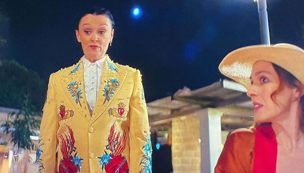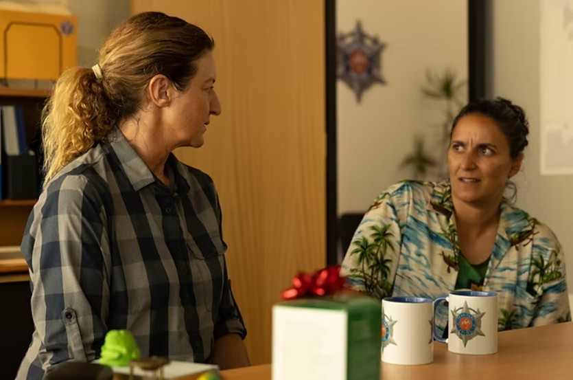 Deadloch is a Tasmanian coastal town that is chock full of lesbians. When a naked dude washes up dead on the beach, it falls to Senior Seargent Dulcie Collins (Kate Box) to investigate. There’s the familiar setup where she’s a former big city cop who has moved to an oddball small town after some kind of incident, but her slightly noirish hardboiled attitude is amusingly offset by her relationship with her new age, touchy feely wife Cath (Alicia Gardner). She keeps having to process her feelings in the middle of her investigations or take a casserole along with her. When a detective is sent from the mainland to supervise the case, it sets Dulcie up in a classic oddball pairing with a sloppy, crude, obnoxious partner who bumbles around in a Hawaiian shirt and sandals. The stereotypical messy, potty-mouthed detective everyone has to put up with is almost always a guy, but Deadloch flips all the gender-based genre conventions so Detective Eddie Radcliffe is played here very entertainingly by Madeleine Sami (beloved for Our Flag Means Death) and just for an extra twist, despite her fashion choices she’s actually the token straight person.