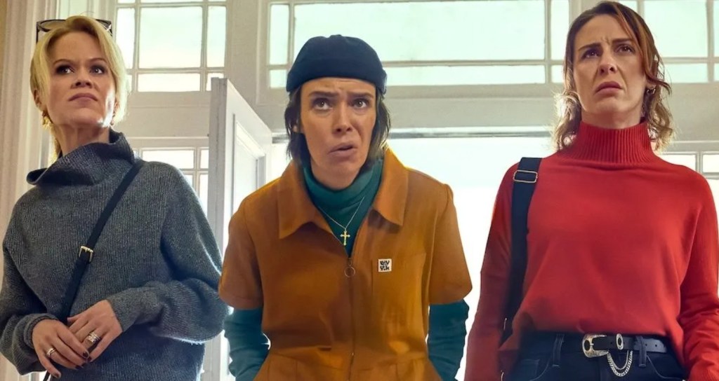 Saoirse (Roisin Gallagher) is the screenwriter for a successful BAFTA-winning crime drama called Murder Code, Robyn (Sinéad Keenan) is a stay-at-home mom with three kids, and Dara (Caoilfhionn Dunne) is a closeted lesbian who is taking care of her theoretically ailing mother. All three of them are telling themselves they should be happy but they’re all frustrated or missing something in their lives. Maybe it’s the common middle age state of having arrived somewhere and realized what it’s actually like there isn’t all it was cracked up to be, but for the three of them it’s clearly tied to the shared trauma they went through with Greta (Natasha O’Keefe from Peaky Blinders) when they were younger. There are lovely scenes scattered through the show where they watch their younger selves superimposed next to them which I felt really captured the painful mix of fond memory, nostalgia, and loss that accompanies revisiting your past. The voiceover describes them as being “separate but inseparable” and through all of the chaotic things that happen as they search for the truth about Greta and all the ways they mess up, they still have each other’s backs.