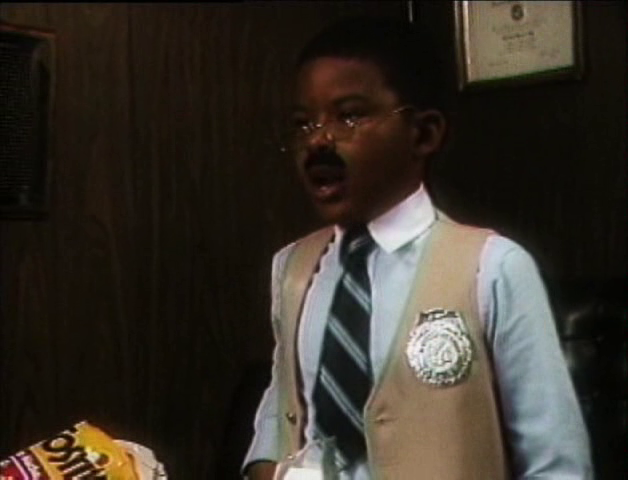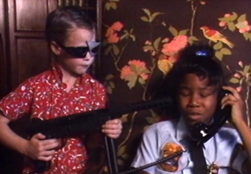 One of the funniest aspects of the film is the sight gags involving the children’s short stature. The shots aren’t set up to make them look adult-sized, and often, you can see the actors struggling to reach things or open heavy doors. Additionally, often during puberty, girls get their growth spurt a few years before boys do, so many of the actresses tower over their male counterparts. Early in the film, Jones and McAllister take a ride in a police car, and it’s apparent that Jones can’t physically see over the steering wheel, but that doesn’t stop him from putting the pedal to the metal. Although the novelty of seeing kids act like adults wears off sooner rather than later, Lowrey continuously finds new ways to make light of the situation. Some standout moments include an “old” couple wearing grey wigs with walkers, a soap opera clip where a wife finds out her husband is cheating on her, complete with the camera zooming in on their shocked faces, and a tough gas station robber wearing a cheap Halloween mask with a fake five o’clock shadow stippled haphazardly onto his face.