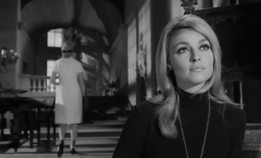 Catherine is puzzled by Philippe’s demeanor and the strange people surrounding him in Bellenac. Siblings Christian (David Hemmings) and Odile de Caray are both pale, platinum blond, beautiful and clad in black. Christian carries a bow and, on Catherine’s arrival, shoots a dove that falls before her. Philippe’s aunt Estelle (Flora Robson) considers Christian to be “a very wicked boy and his sister is no better.” Odile (a dubbed Sharon Tate) wears an amulet reminiscent of one that protects against the Evil Eye, but its meaning goes far beyond that to Philippe, the local people and even Père Dominic (Donald Pleasance), the soft-spoken local parish priest. Odile seems especially interested in Jacques. Asking if he believes in magic, she seems transform a frog into a dove for him. Antoinette is not fooled, but Jacques ignores her protestations because in this story, men and boys are the ones entranced and enthralled by ancient beliefs. Though Odile does hypnotize Catherine and nearly convinces her to walk off a parapet to her death. Philippe beats Odile in retaliation—once a refined Parisian gentleman, suddenly every inch Bellenac’s brutal feudal lord.