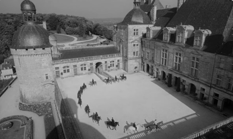Eye of the Devil leans on the white for the horror. There are ominous scenes of shadow, but much of Catherine’s investigation is enclosed indoors in darkness as she struggles to piece together what is happening. But the horror? The horror is in broad daylight. The choice to film so much in the daytime, in the daylight itself underscores how much of what Bellenac hides in plain sight. It is all concealed in apparent orthodoxy and a dual understanding. It bends reality. The breathtaking sequence of Philippe riding out to his death, leading a procession of his killers from the chateau’s white stone courtyard into the forest is more powerful for the choice to shoot it in the daytime, brightly lit, and in the open.