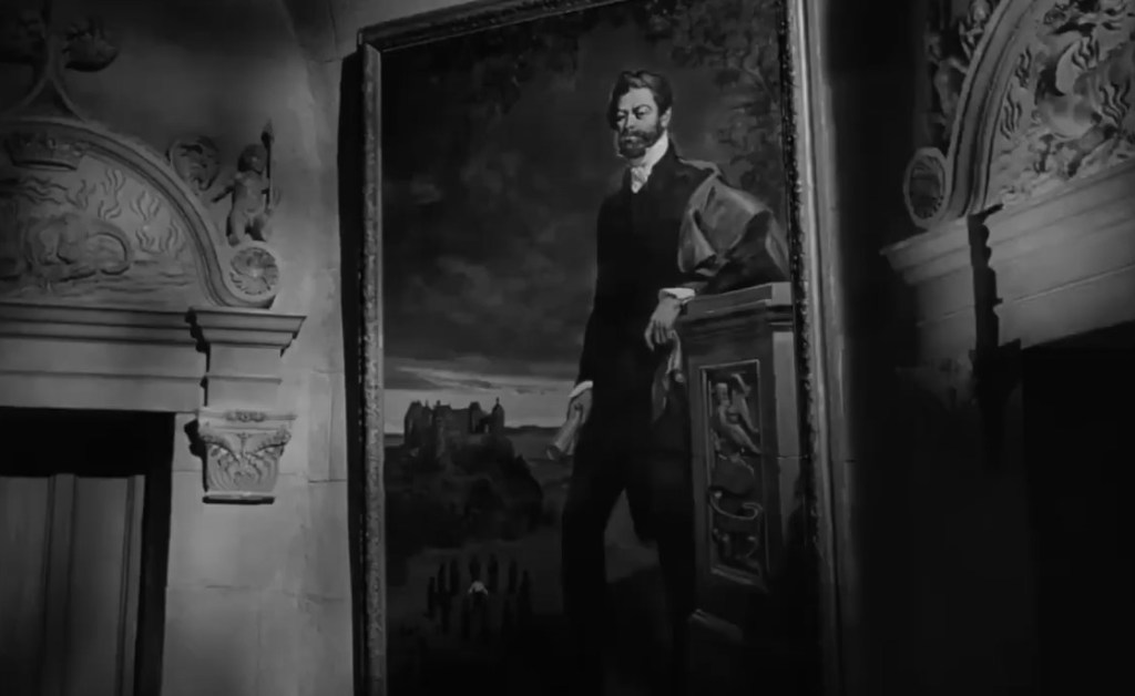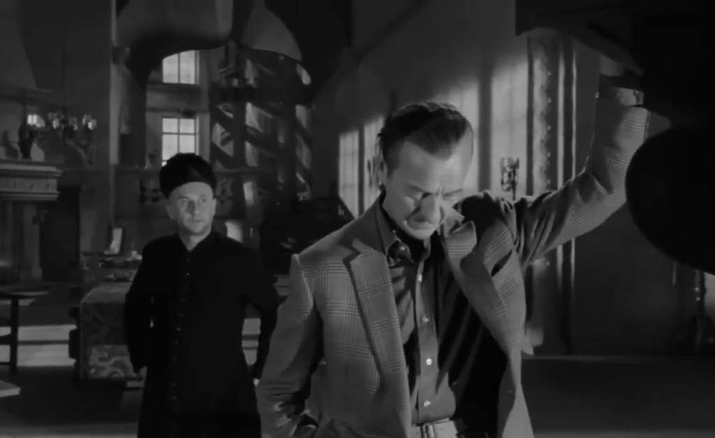 Catherine attends a special church service for the annual village fête held every year on July 31st: Le Trieze Jours, the Thirteen Days. It’s a strange name for a celebration lasting a single day. When Philippe picks up and pointedly kisses Jacques outside the church, the crowd gasps and Estelle cries out. Having lost her brother to Bellenac’s ways and fearing losing Jacques, too, Estelle finally shares her secret—her brother, Alain (Emlyn Williams), is alive, hiding in the room above her own in what was once his castle. It’s a nice inversion of the Gothic convention of a woman hidden or sequestered inside a tower room. Philippe confronts Estelle and she admits she has told Catherine that Alain is alive. Philippe is contemptuous of his father, saying, “He is not one of the men of this family.” It hearkens back to a conversation right after Philippe’s arrival when Estelle said that the chateau “is not place for a woman. It never has been. I sometimes believe you’re all mad—every man of this family from the very beginning.” She pleads with Philippe to leave with Catherine and their children, but he will not. Despite Estelle’s entreaties, Philippe is determined not only to embrace his fate, but to include Jacques. He brings Jacques to the service consecrating him. Led by Père Dominic, and with Jacques watching, Philippe kneels on the center of a star worked into the chapel floor. Hooded men surround him as together they recite the words Catherine read in Edouard’s crypt.