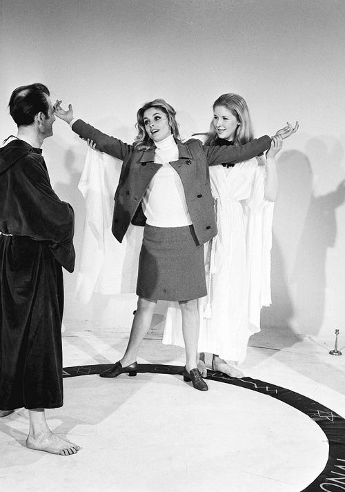 While film doesn’t have time in the same way books do, it has spectacle—including promotional spectacle. According to Daily Mirror photographs from 1966, the filmmakers “signed” Alexandrian Wiccan High Priest Alex Sanders and High Priestess Maxine Morris to consult on Eye of the Devil with the intention of making its ritual more realistic. According to Morris, the extant of their consultation was a set visit and photos with Sharon Tate and J. Lee Thompson.